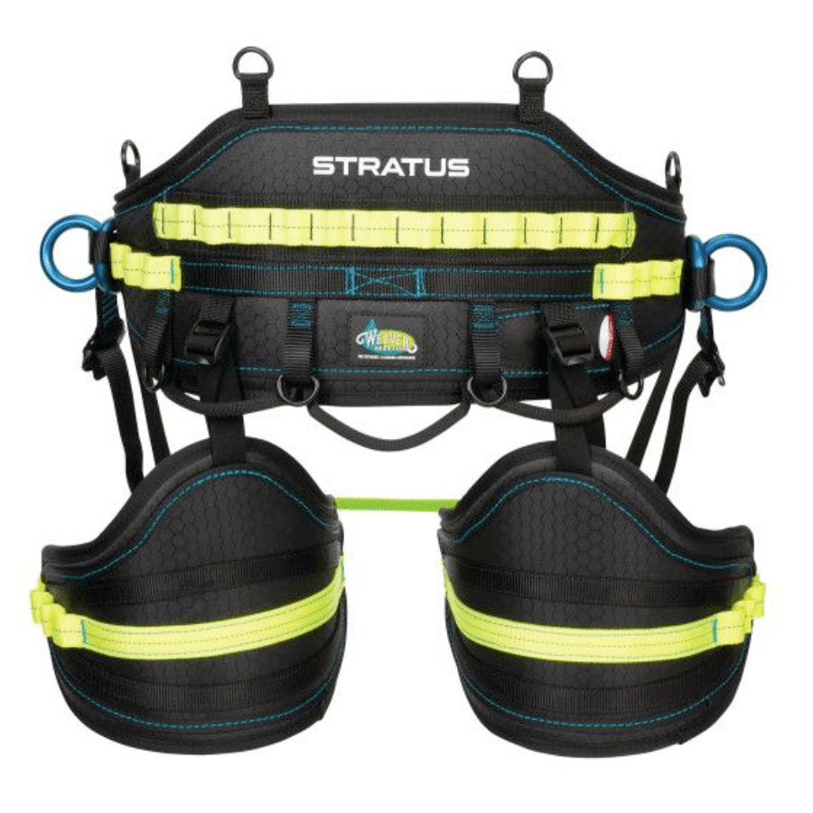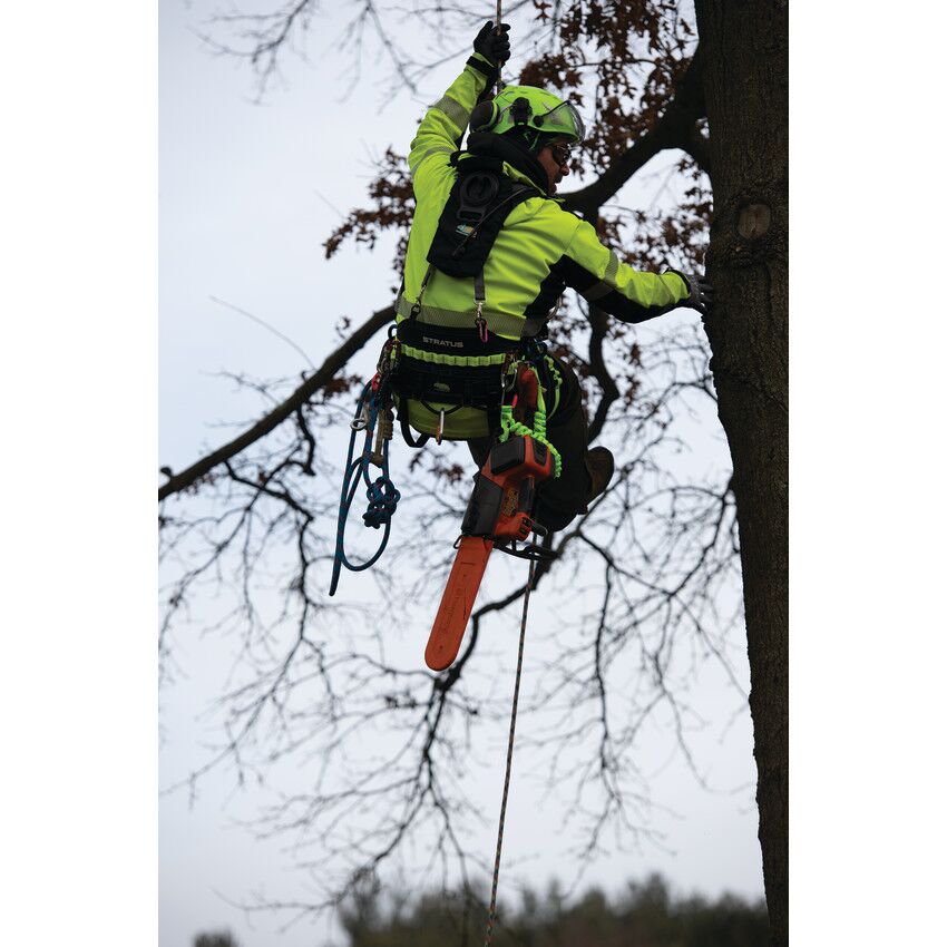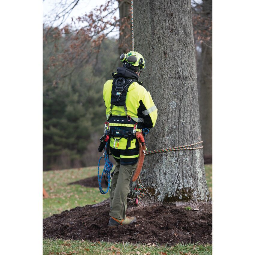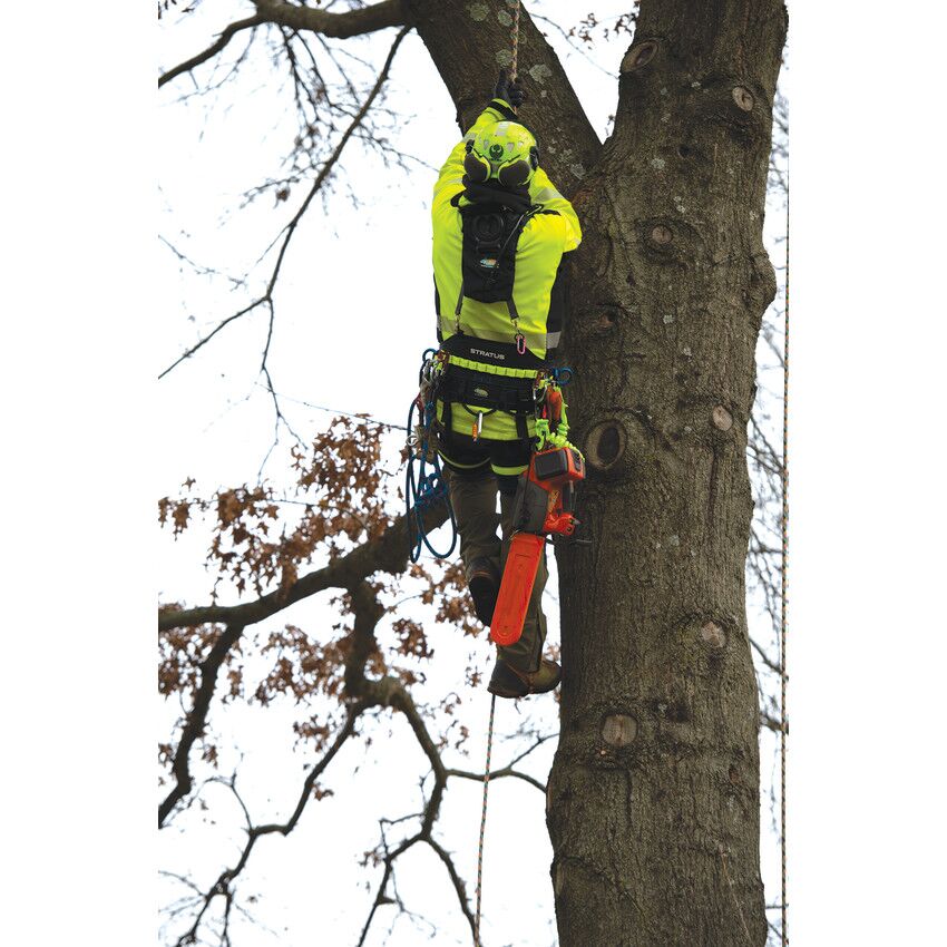Take your climbing to the next level with the new, performance-oriented Stratus positioning saddle. Handcrafted in the USA by the finest craftspeople who care about every last detail, the Stratus boasts a modern, ultra-lightweight design and high-performing features. The comfortable back pad is crafted from durable 600 denier polyester in a sleek honeycomb design, giving the Stratus a modern look and feel. The back and leg pads feature breathable inner spacer mesh, and the suspension bridge and leg pad height can be easily adjusted for the perfect fit. ISC quick-release buckles on the waist and leg straps offer easy on and off and a contemporary look. High-strength nylon webbing with multiple gear loops allow for easy, personalized configuration, and the rope bridge and webbing details are brightly colored to provide additional visibility while on the job. The double braid rope bridge is securely attached using a double overhand stopper knot on each side, which can be easily replicated when replacement is necessary. Lightweight aluminum hip dees and rigging plates provide multiple attachment points, offering arborists even more flexibility. The Stratus also features four attachment rings for suspenders and specific spots for chainsaw storage, as well as lower dees that are perfect for attaching lanyards and additional gear. This lightweight, functional saddle was designed with the modern arborist’s needs in mind in order to deliver the ultimate climbing experience.