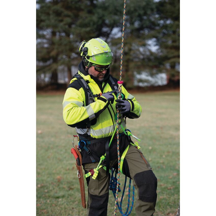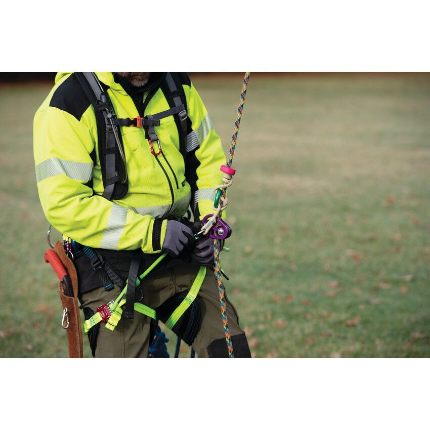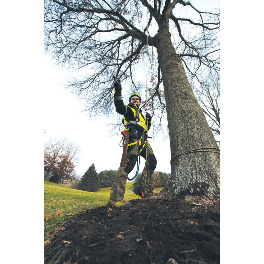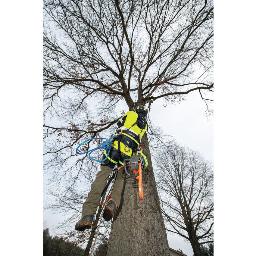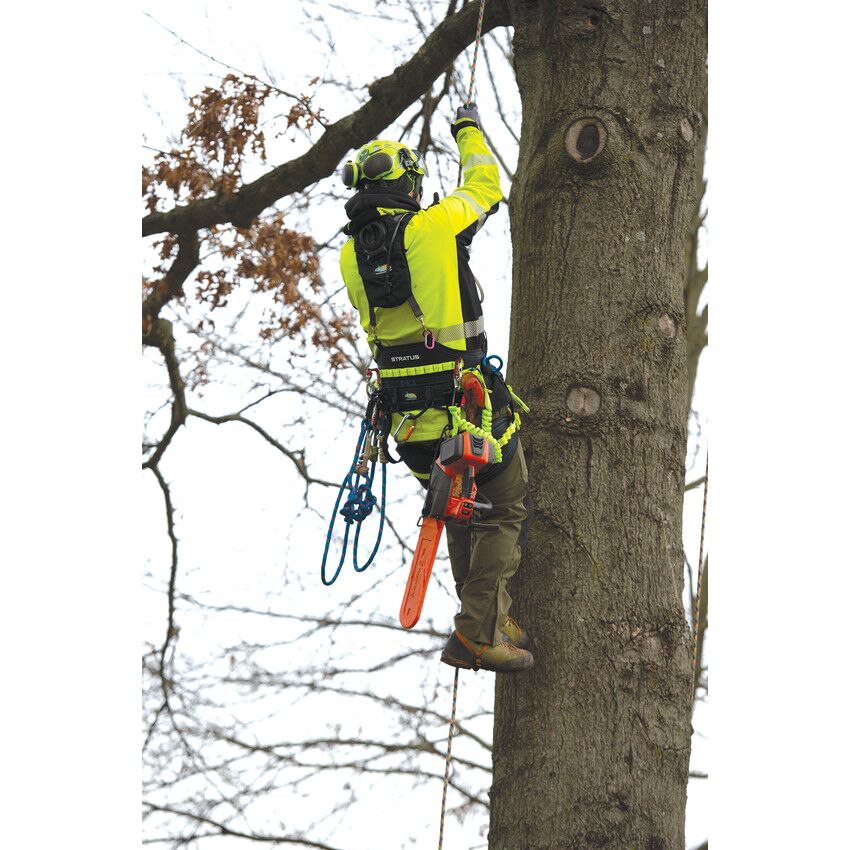 Take your climbing to the next level with the new, performance-oriented Stratus positioning saddle. Handcrafted in the USA by the finest craftspeople who care about every last detail, the Stratus boasts a modern, ultra-lightweight design and high-performing features. The comfortable back pad is crafted from durable 600 denier polyester in a sleek honeycomb design, giving the Stratus a modern look and feel. The back and leg pads feature breathable inner spacer mesh, and the suspension bridge and leg pad height can be easily adjusted for the perfect fit. ISC quick-release buckles on the waist and leg straps offer easy on and off and a contemporary look. High-strength nylon webbing with multiple gear loops allow for easy, personalized configuration, and the rope bridge and webbing details are brightly colored to provide additional visibility while on the job. The double braid rope bridge is securely attached using a double overhand stopper knot on each side, which can be easily replicated when replacement is necessary. Lightweight aluminum hip dees and rigging plates provide multiple attachment points, offering arborists even more flexibility. The Stratus also features four attachment rings for suspenders and specific spots for chainsaw storage, as well as lower dees that are perfect for attaching lanyards and additional gear. This lightweight, functional saddle was designed with the modern arborist’s needs in mind in order to deliver the ultimate climbing experience.